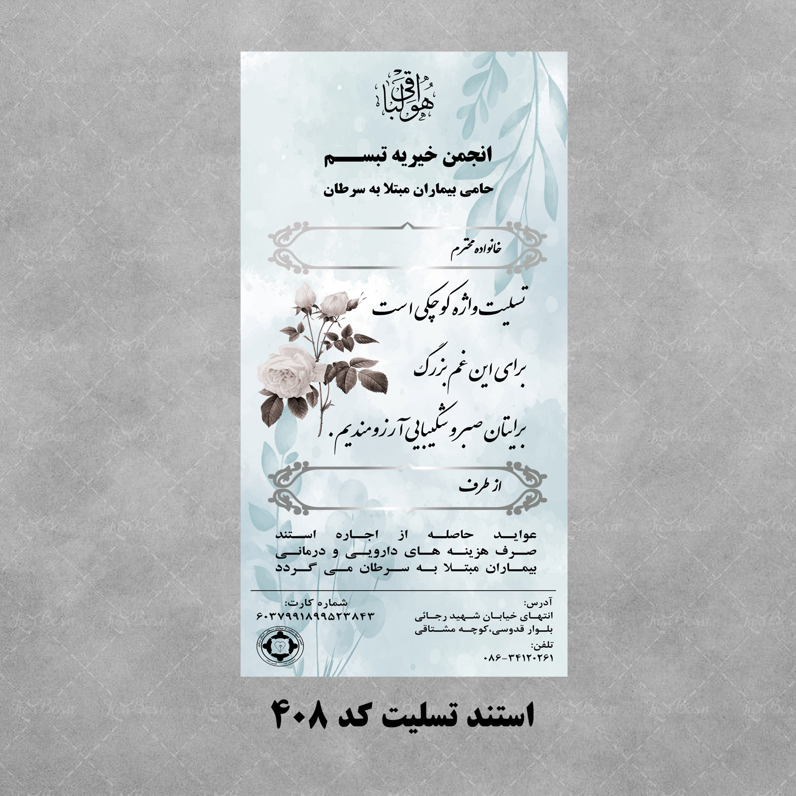 با سفارش استندهای تسلیت انجمن خیریه تبسم،ضمن ابراز همدردی و عرض تسلیت برای خانواده متوفی،در تأمین هزینه های دارویی و درمانی بیماران مبتلا به سرطان مشارکت نمایید.
