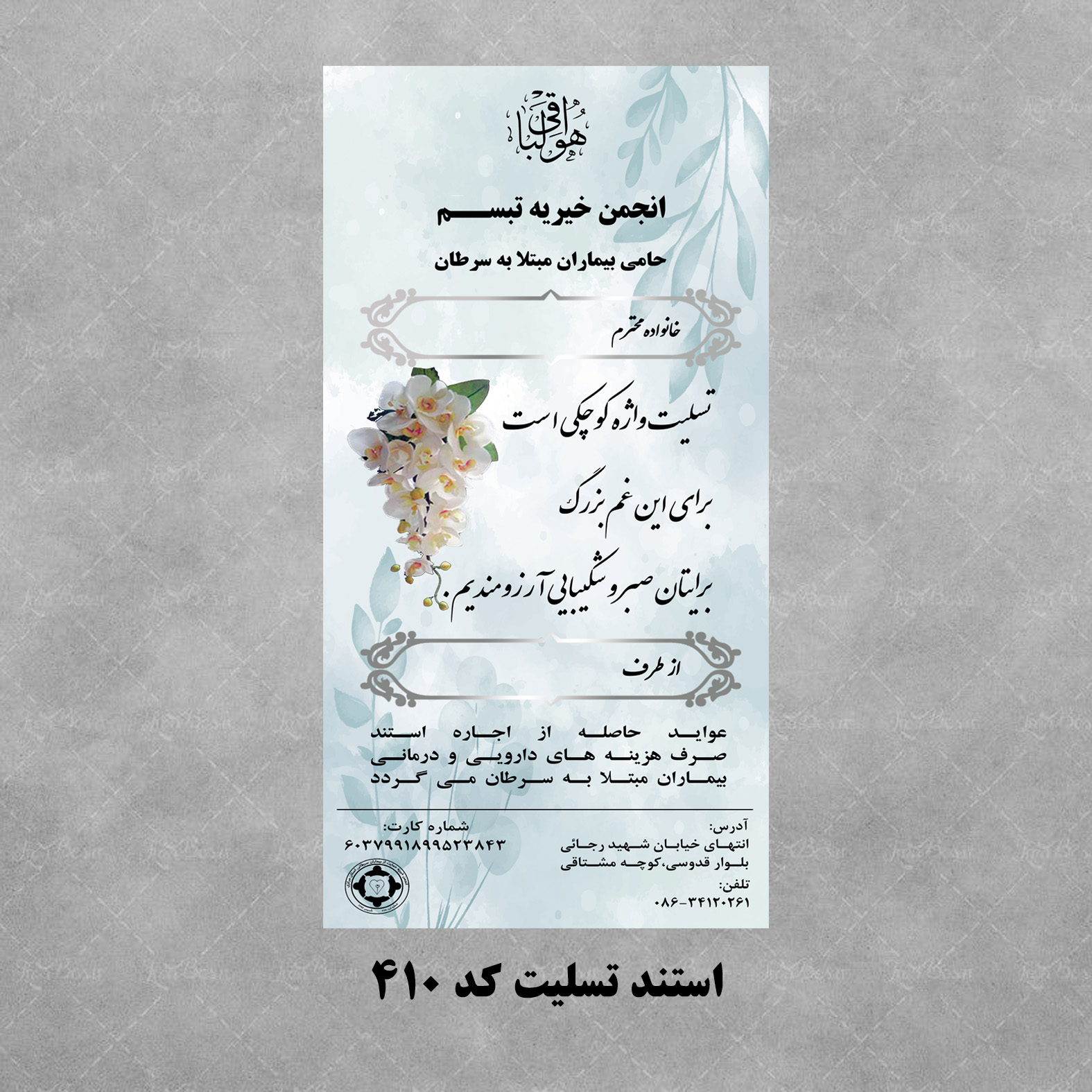 با سفارش استندهای تسلیت انجمن خیریه تبسم،ضمن ابراز همدردی و عرض تسلیت برای خانواده متوفی،در تأمین هزینه های دارویی و درمانی بیماران مبتلا به سرطان مشارکت نمایید.