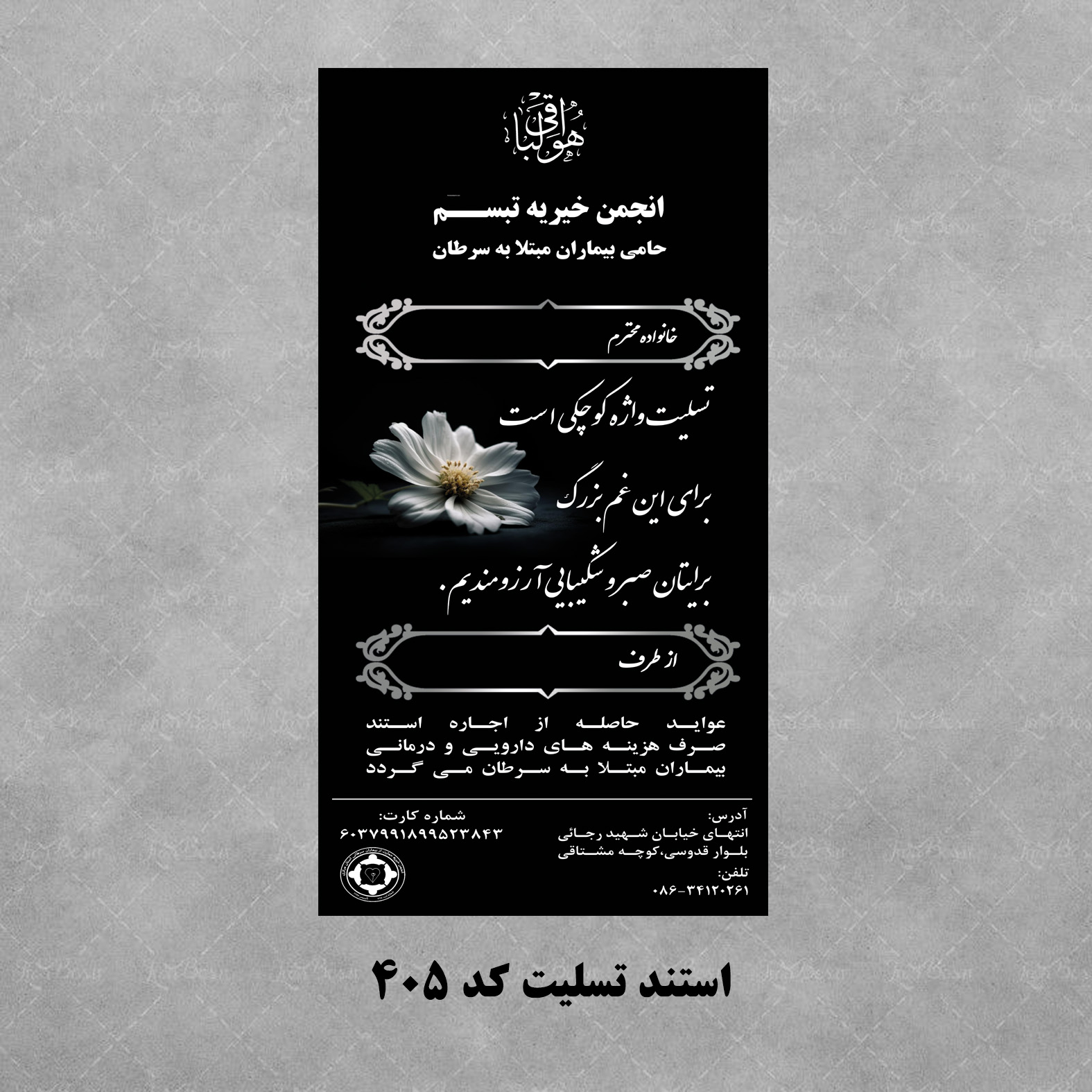 با سفارش استندهای تسلیت انجمن خیریه تبسم،ضمن ابراز همدردی و عرض تسلیت برای خانواده متوفی،در تأمین هزینه های دارویی و درمانی بیماران مبتلا به سرطان مشارکت نمایید.